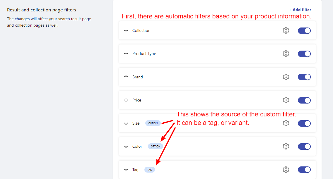 In the Rapid Search admin, Settings, Filters menu, you can choose which filters you wish to enable on your storefront: Collection, Product type, Price, Color, Brand, Availability, Tag filter, and you may filter for any of the variants you have added to your products in your Shopify admin, as well as create a custom filter based on product tags.