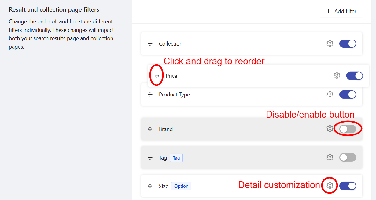 - The filters may be enabled or disabled, dragged and dropped to change their order,