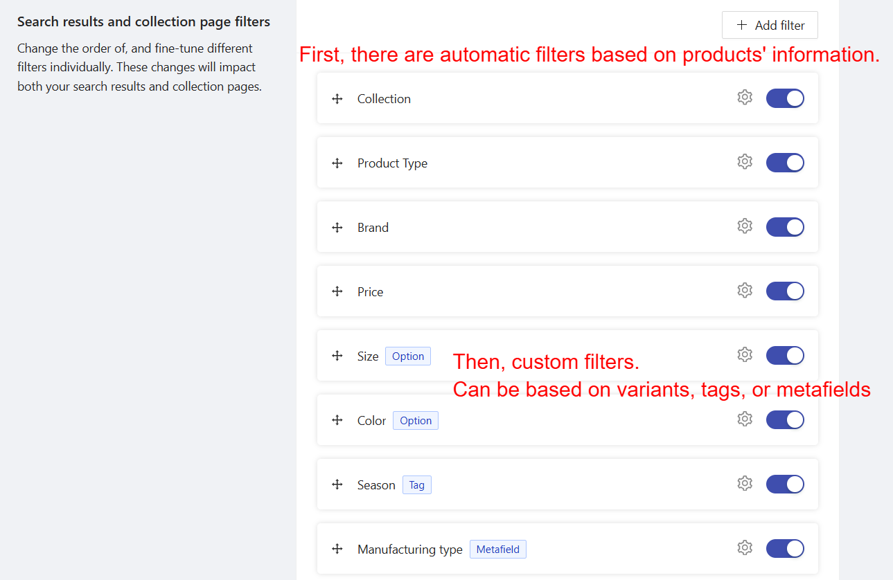 Your collections and your search results can be filtered also by the variants you have added to your products in your Shopify admin. This means you can have more filters by adding new Variants in your Shopify admin and enriching them with various Options (i.e. Variant: "Material", Options: "metal", "wood", "ceramic", "plastic"). (For further info about adding variants, please consult this article.)
